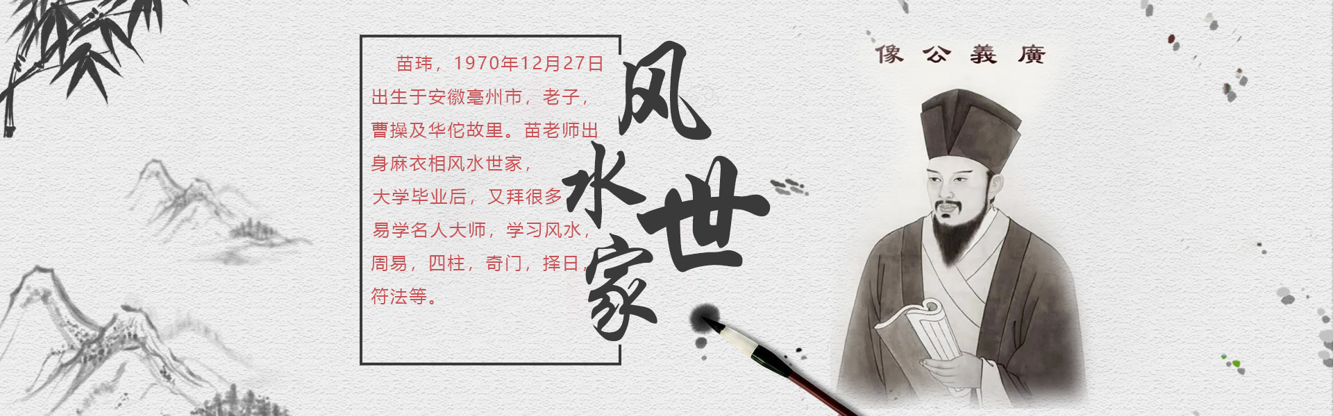 苗瑋,1970年12月27日,出生于安徽亳州市,老子,曹操及華佗故里。苗老師出身麻衣相風(fēng)水世家,受家庭影響,對(duì)風(fēng)水學(xué)有很大興趣,從小受爺爺父親熏陶學(xué)習(xí)風(fēng)水,大專畢業(yè)后,又拜很多易學(xué)名人大師。學(xué)習(xí)風(fēng)水,周易,四柱,奇門,擇日,符法等